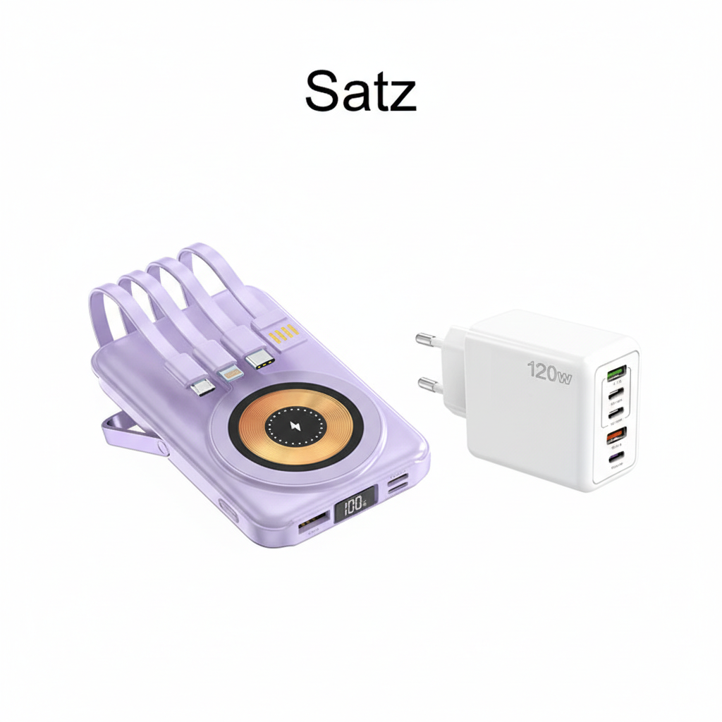 EINGEBAUTES MULTI-KABEL-SYSTEM – Diese Powerbank ist mit vier integrierten Anschlüssen ausgestattet: Lightning, Typ-C, Micro USB und USB-A. Sie ermöglicht das gleichzeitige Aufladen mehrerer Geräte, ohne dass zusätzliche Kabel benötigt werden. Egal, ob Sie mit leichtem Gepäck reisen oder mehrere Geräte unterwegs verwalten, dieses All-in-One-Design spart Platz und reduziert das Durcheinander. Nehmen Sie einfach ein Gerät, und Sie sind für jede Ladesituation gerüstet.